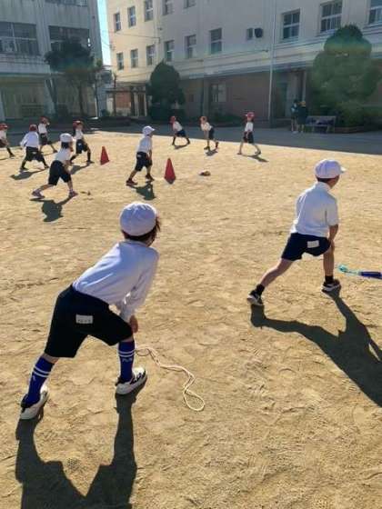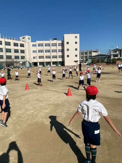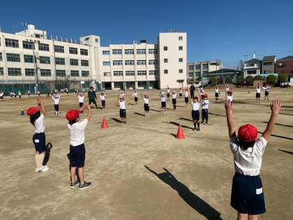 1年生の体育の様子です。先生に見守られながらも、体育係さんを中心にして、クラスのみんなで準備体操を進めていました。4月からの成長を感じます。