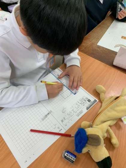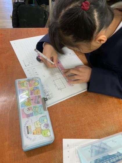 長方形、正方形、直角三角形をかこうのめあてで、頑張っていました。定規を正しく使ったり、長さを正確に測ったりしながら、丁寧に作図できていました。