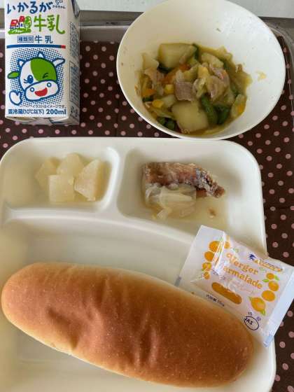 「あじのレモンマリネ」は、1人1枚のあじをなたね油であげ、炒めたたまねぎと生のレモンをしぼった果汁などで作った調味液をからませます。