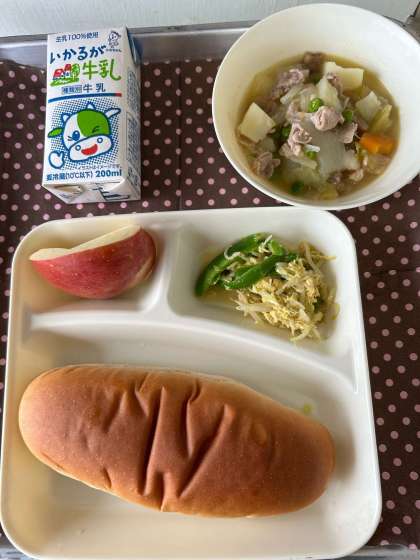 「豚肉と野菜のスープ煮」は、豚肉を主材に、じゃがいも、玉ねぎ、キャベツ、にんじん、マッシュルーム、青みにグリンピースを使った具沢山のスープです。