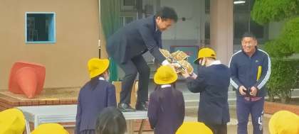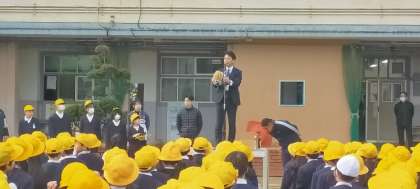 大桐小学校では、月に1回(夏季は除く)運動場で児童朝会をしています。今日は、大谷選手のグローブが届いたので、代表委員会の児童に渡しました。今日から、各クラスに順々にグローブを回していきます。