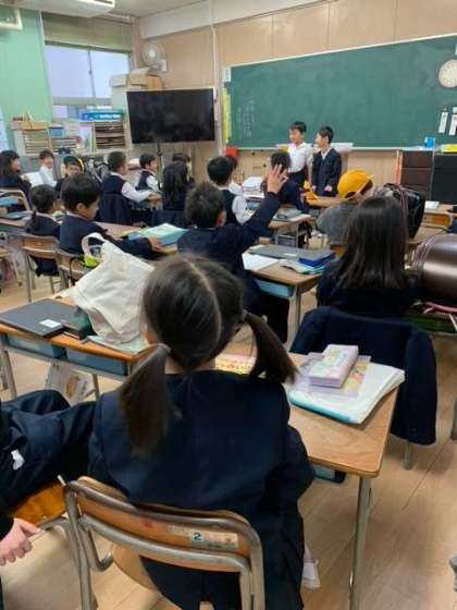 1年生の朝の会の様子です。日直の子が、1分間スピーチとして最近あったできごとをみんなの前で話します。