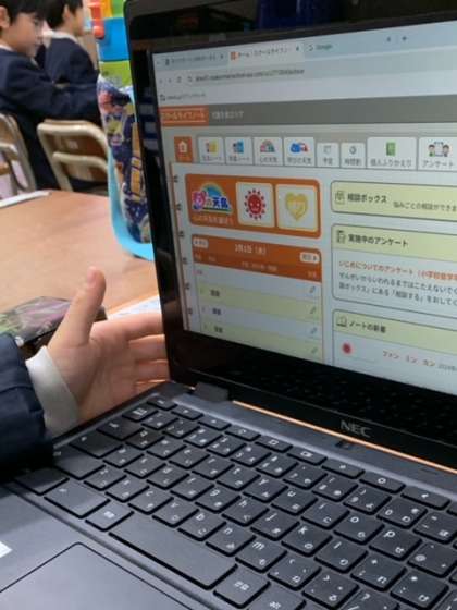 また、別の学級では、端末で心の天気を手際よく入力している子どもたちの姿がありました。(写真下)
