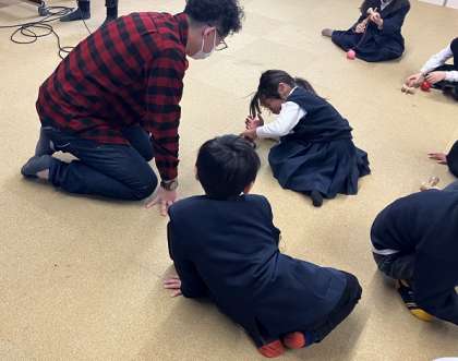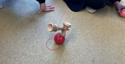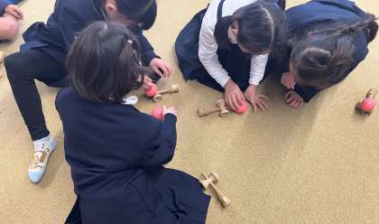 1年生のけん玉授業の様子です。ゲスト講師の方に、いろいろな技を教えてもらい、実際にやってみます。なかなかできないときは、先生や周りのお友達が手助けをしてくれて、技を完成させることができました。みんな、とても楽しそうです。