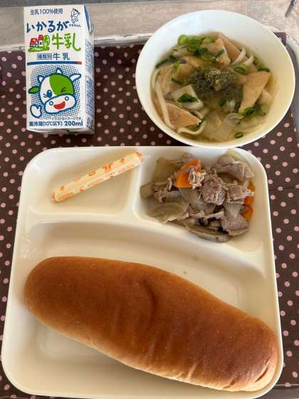 「なにわうどん」は1/16の三角に切ったうすあげを焼き物機で煮ます。かまぼこ、はくさいと青みに青ねぎを加え、だしの旨みを味わうことのできるシンプルなうどんです。とろろこんぶを1人1袋ずつ入れていただきます。