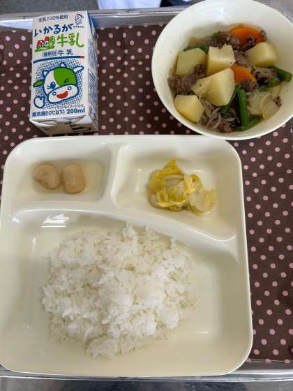 「白花豆の煮もの」は、焼き物機で煮ます。白花豆は、鉄や食物繊維が多く含まれており、児童生徒に食べてもらいたい食品です。