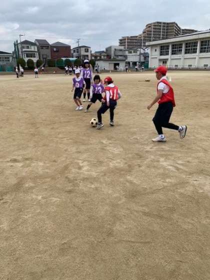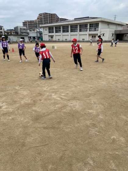 3年生のラインサッカーの様子です。ラインサッカーは、ゴールラインを越えると得点になるので、点数が入りやすいです。ゴールする度に、「イェーイ!!」と楽しそうな声が上がっていました。