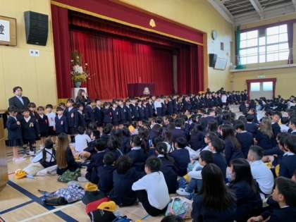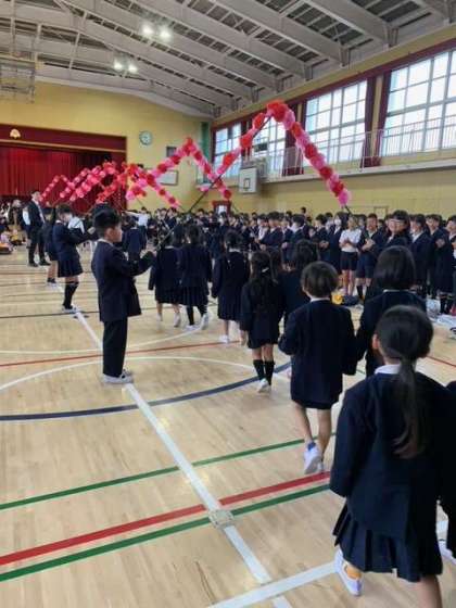 新1年生が、「おにいさん!おねえさん!よろしくおねがいします!」と、元気にご挨拶してくれました。お行儀よくみんなの前で、並べていて感心しました。