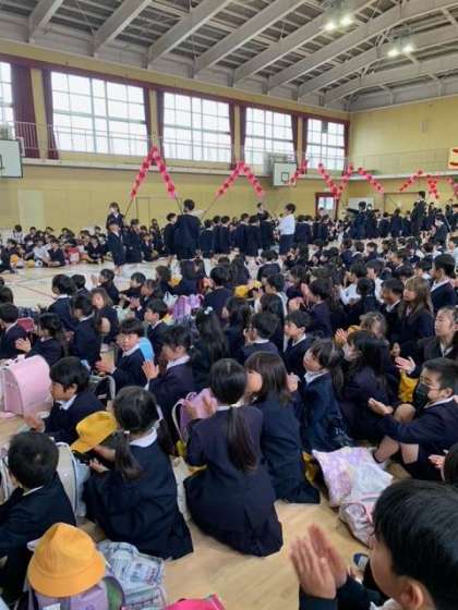 着任式・始業式に続いて、新1年生と在校生との対面式がありました。代表委員会の人たちが、作ってくれた花のアーチをくぐって、在校生の前に登場してくれました。代表児童の歓迎の言葉の後、