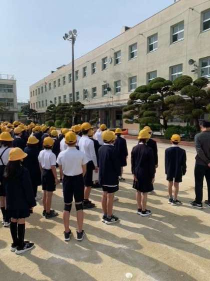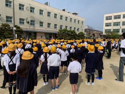 去年までは、月1回の運動場での全校朝会を、今年から月2回にすることにしました。残りは、これまで通りテレビ朝会です。
