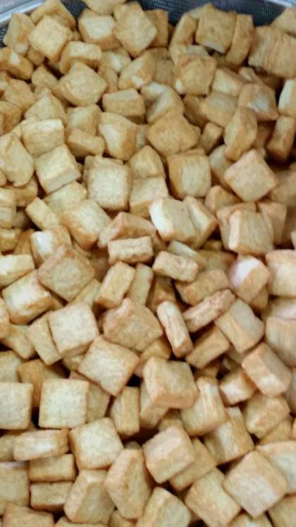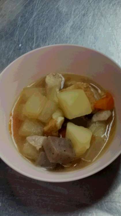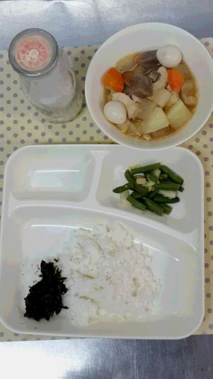 「関東煮」には、厚揚げが入っています。厚揚げには、たんぱく質やカルシウムが多く含まれています。うずら卵も入っていますので、卵アレルギーの児童は、うずら卵抜きの個別対応の関東煮をピンクの食器で食べます。