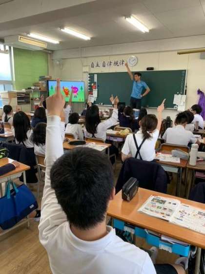 先生と一緒に、リズムに乗って英語学習を楽しんでいました。
