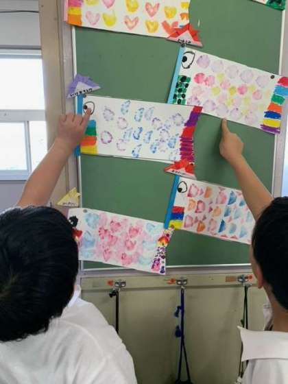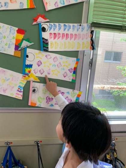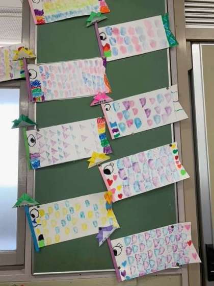 2年生の教室に入ると、「見て見てー!」と、図画工作で制作したこいのぼりを色々な子が紹介してくれました。かわいらしいこいのぼりが、各クラスで飾られることになります。学習参観の時まで掲示しておりますので、是非、ご覧になってください。