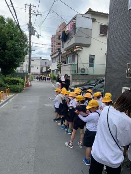 公園や、神社、ポストなど、みんなが使う施設や物をたくさん見つけました。普段、当たり前に過ごしている町も、みんなでじっくり見学すると、色々な気づきがあります。そして、みんなで周ると楽しかったようで、ニコニコ、とても良い表情でした!