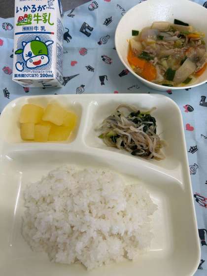 「中華煮」は、豚肉を主材に、キャベツ、玉ねぎ、たけのこ、にんじんを使用した中華風の煮ものです。青みににらを加えます。