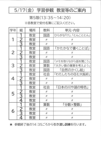 令和6年度 5月17日(金)の学習参観の教室等のご案内です。