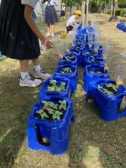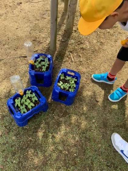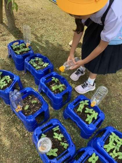 毎朝、成長の様子を見ながら水遣りをしています。ニコニコしながら、お水をあげているのが印象的でした。大きくなって、きれいな花が咲いてくれるといいね。