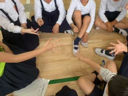縦割り班は、1〜6年生が混合の10人程度で編成し、6年生がリーダーを務めます。自己紹介の後、じゃんけん大会やしりとりをして楽しみました。司会の子からは、「名前や顔を覚えて楽しく頑張りましょう。」というメッセージがありました。