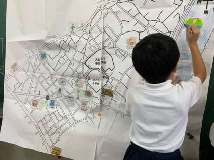 1人ひとりが、イラストにし地図に貼り付けていきました。大桐の町のステキをたくさん見つけられるといいですね。