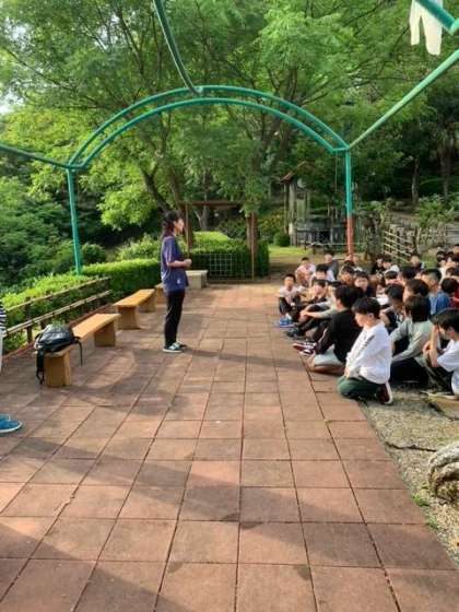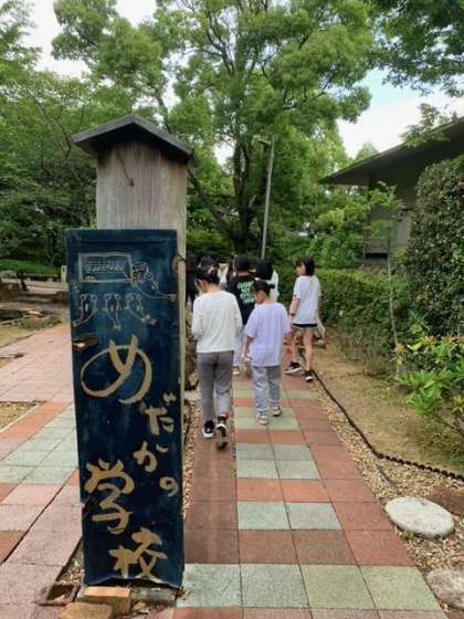 朝の集いを、宿に隣接しているメダカの学校で行いました。