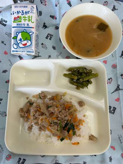「豚ひき肉とにらのそぼろ丼」は、豚ひき肉、玉ねぎ、にんじん、青みににらを使っています。