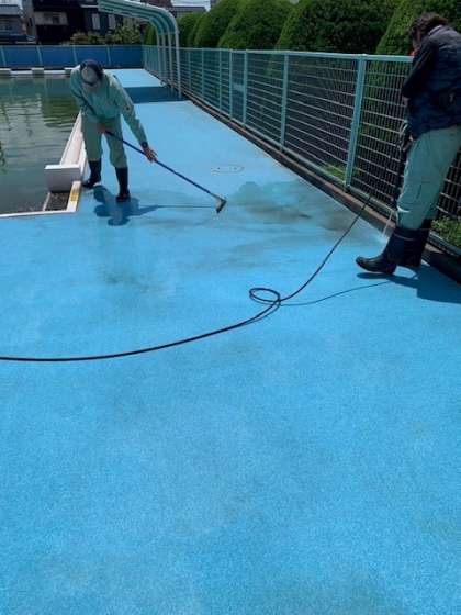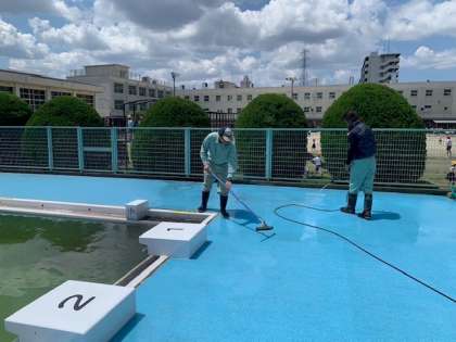 本校では6月18日より、プール水泳授業が始まります。今月に入ってから管理作業員さんが丁寧にお掃除を進めてくださっています。とてもきれいなピカピカのプールに入るのが、今から楽しみですね!