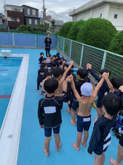 バディの安全を守ることも、水泳時間の大事な学習です。一生懸命「オー!!」と声を出して頑張る姿は、かっこよくもあり、可愛らしいです!