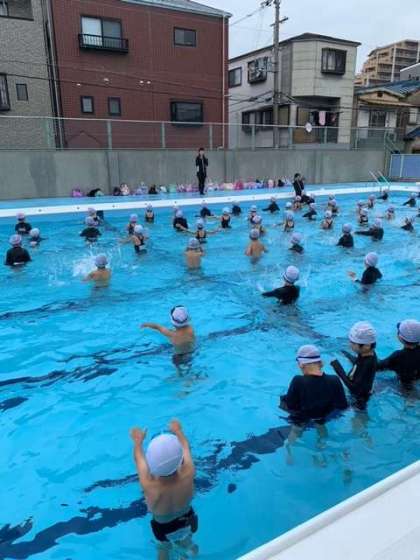プールに入ると、元気に水しぶきをあげていました。顔をお水につけられない子はまだまだたくさんいますが、楽しみながら水慣れを頑張っています。プールを好きな子が増えているようで嬉しいです。