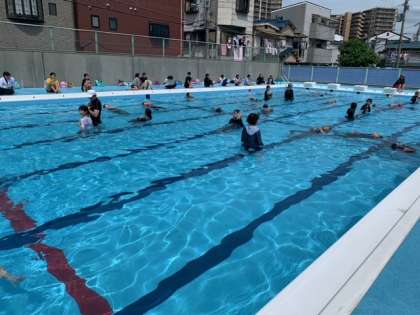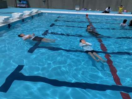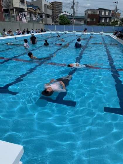 もしも水難事故にあってしまった場合などを想定し、10分間浮き続ける練習をしました。先生方のご指導のもと、真剣な態度で取り組めていました。