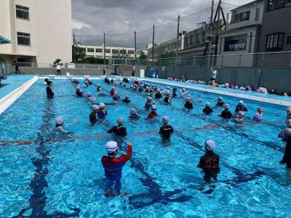 昨日に続き、着衣泳の授業の様子です。本日は4年生と6年3・4組が授業です。普段の水着のまま入るのと、服を着て入るときの感覚の違いを学習しました。感想を聞いてみると「ぞわぞわする。」とのことでした。