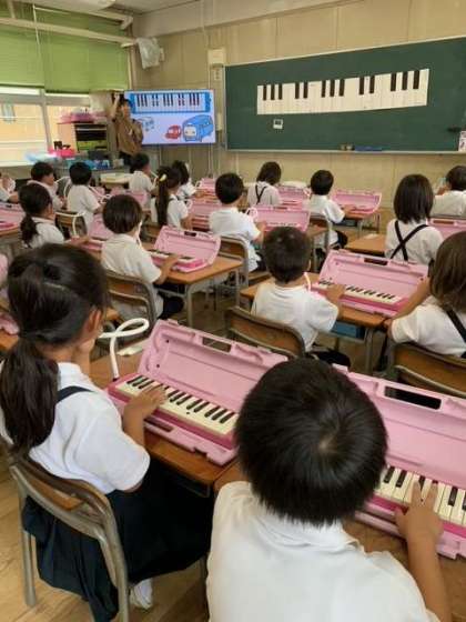 1年生の音楽の様子です。ピアニカで、乗用車やバス、救急車の音を表現して楽しみました。