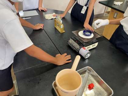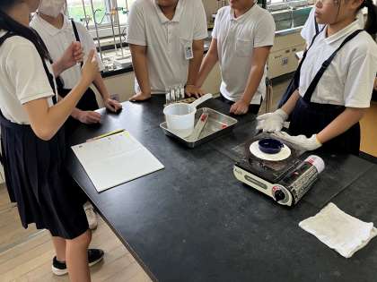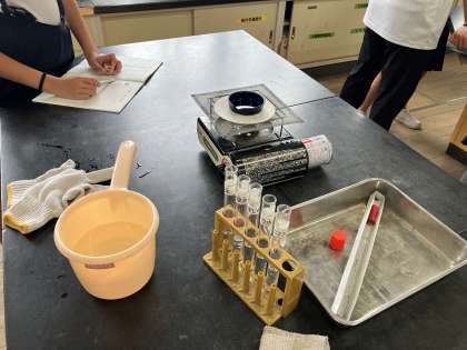 6年生の理科の授業風景です。今日は「水溶液の区別」という学習です。理科室で実験を行いながらの授業でした。班に分かれて協力しながら実験を進めています。