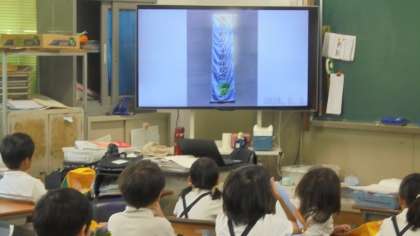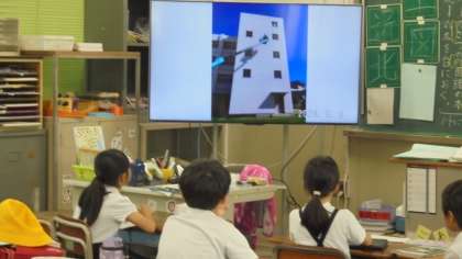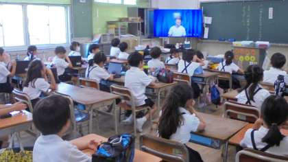 毎週月曜日は児童朝会があります。今月はまだ暑い日が続きますのでしばらくはテレビでの朝会になります。校長先生との朝のあいさつから始まり先週の登校のようすを看護当番が伝え、必要な時には学校生活で気になったことを生活指導の担当が子どもたちに伝えます。今週の校長先生のお話は創立60周年の懸垂幕ができたことの紹介でした。