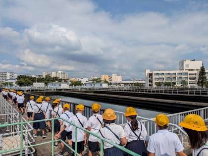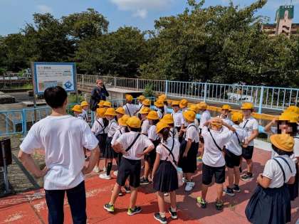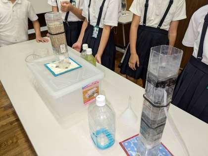 4年生は本日、柴島浄水場へ社会見学へ行っています。日常で使う水道水がどうやって自分たちの元まで来ているのかを学習します。施設内の見学はもちろん、水のろ過の仕組みを知るためにワークショップ体験も行われました。みんな、興味深そうにお話を聞いています。