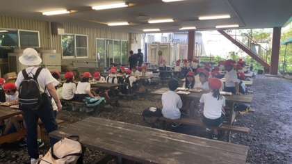宿舎の屋根下で、お弁当タイムです。日陰に入ると、涼しい風が吹いています。