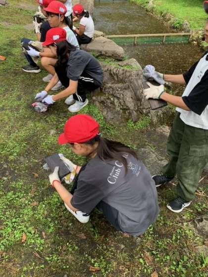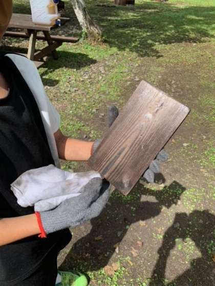 焼き板作りの活動です。古いタオルでゴジゴシすすを落とします。