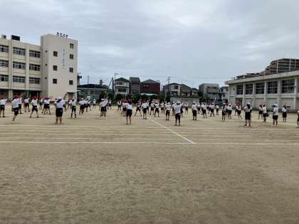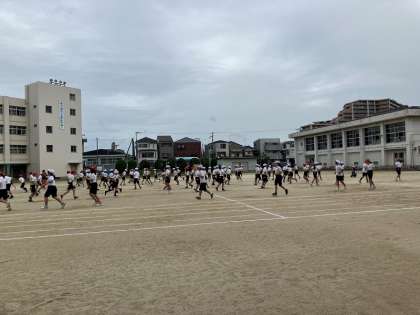 4年生の運動会練習風景です。もうすべてのダンスを通しで踊れるようになっています。運動場で位置を確認し、移動のパートも難なくこなしていました。