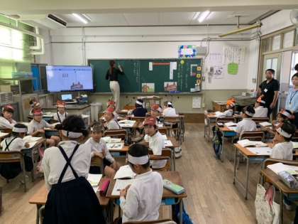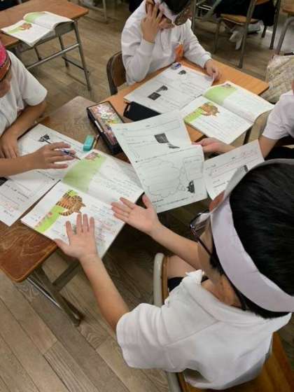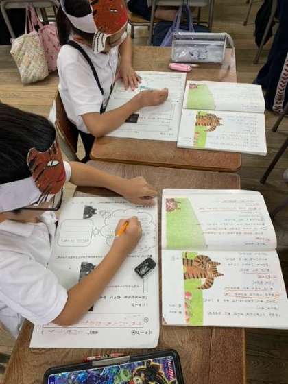 今日の学習は、「猫のタマの気持ちを考えて音読しよう。」がめあてです。この単元の間、猫のタマの気持ちに成り切るための手立てとして、タマのお面を作って学習活動を進めています。お面をつけ動作化の活動を取り入れると、子どもたちが登場人物の気持ちを考える支援に役立ちます。お面をつけたまま、一生懸命タマの気持ちを考えていたのが可愛らしかったです。場面の変化を読み取ることで、工夫して音読する姿が見られました。