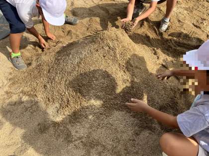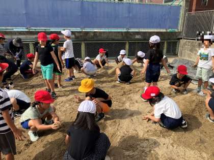 1年生・生活科のどろんこ遊び体験の様子です。みんなで協力して大きな山を作ったり、どろだんごを作って並べたりしています。楽しそうな歓声がたくさん聞こえています。