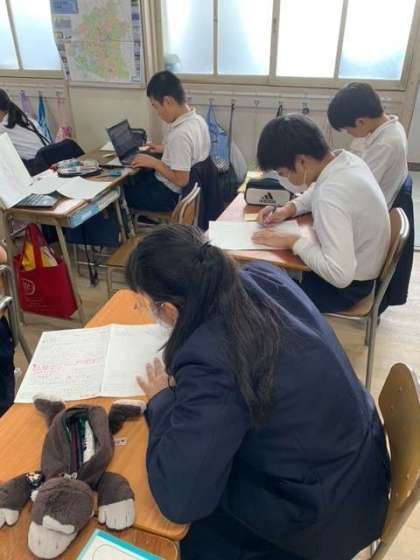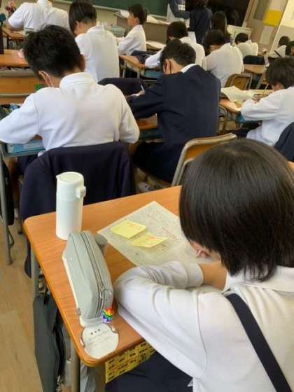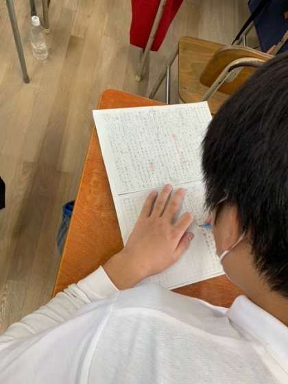 初めに書いた原稿を、担任の先生から赤ペンで修正、ご指導してもらいます。今日は、再度、原稿の書き直しです。書き直しがしっかりできたら、いよいよ清書で本番です。