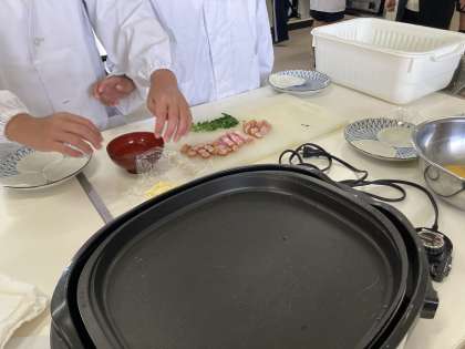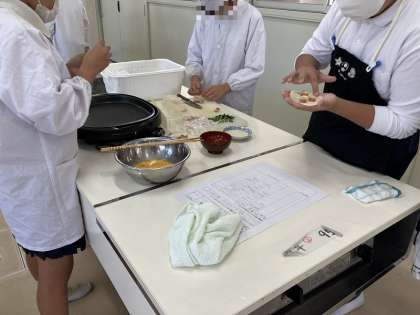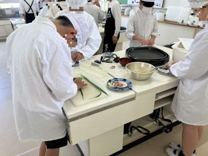 6年生の家庭科授業の様子です。本日は調理実習の日です。餃子とニラ玉を作ります。レシピを確認しながら役割ごとに作業を行います。「今から食べるのが楽しみ〜」と笑顔あふれる活動でした。