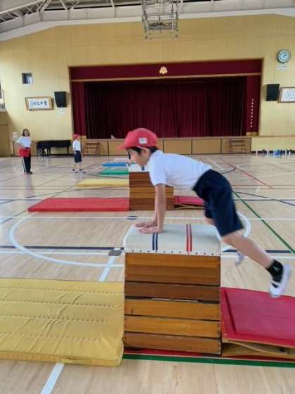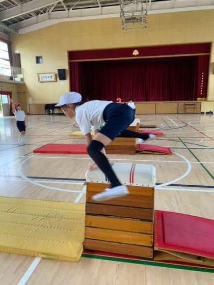 踏切板「ドン!」、跳び箱「バン!」、マット「トン!」など、足や手の着き方や強さを、音で学ぶと感覚が掴みやすいです。今日は、先生から、「ドン!」「バン!」「トン!」と声をかけてもらいながら練習を頑張っていました。自分の目標に向かって、少しずつ上達するといいね。ファイト!