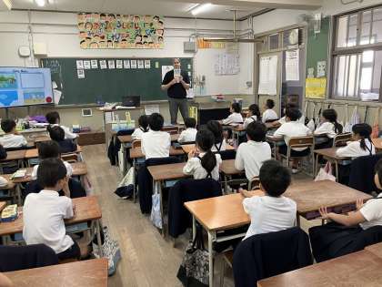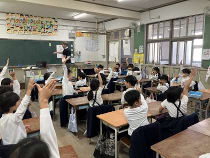 2年生の外国語授業の様子です。C-NETの先生が来てくださり、カードや映像を使っての授業が行われています。「What do you like color?」との問いにたくさんの手が挙がっていました。特に人気の色は「Rainbow!」でした。