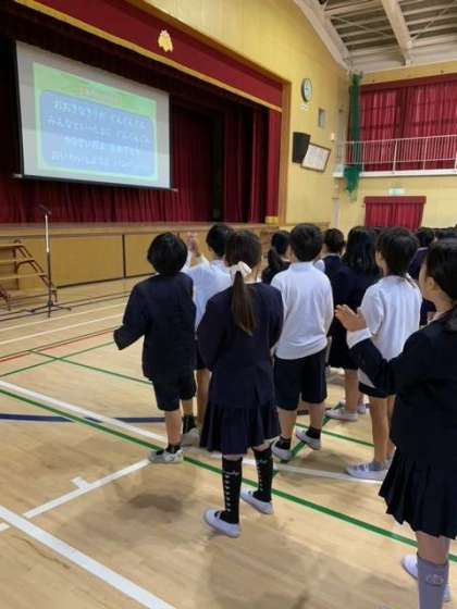 また、式典で全校児童で行う予定の「児童お祝いのことば」や、「お祝いの歌」を練習しました。全校児童で合わせるのは、今日が初めて。そろえるのが難しかったです。限られた時間の中での練習ですが、次回は、さらに上達してくれることを期待しています。