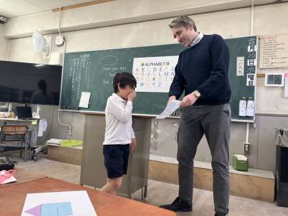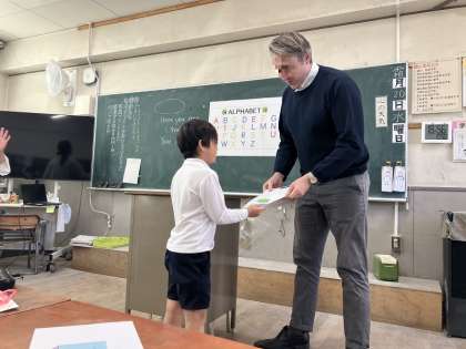 3年生の外国語授業の様子です。C-NETの先生にパソコンで制作したお手紙を渡します。多種多様なデザインがあり、渡すときにも「Here you are!」ととても元気に話すことができていました。