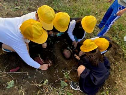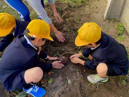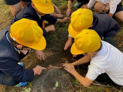 立派なサツマイモができているか期待を込めつつ、グループで協力して慎重に掘り進めていきました。サツマイモの頭が見えてきたときに歓声が上がり、とても大きなサツマイモだとわかるとさらに歓声が上がりました。