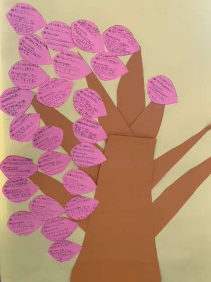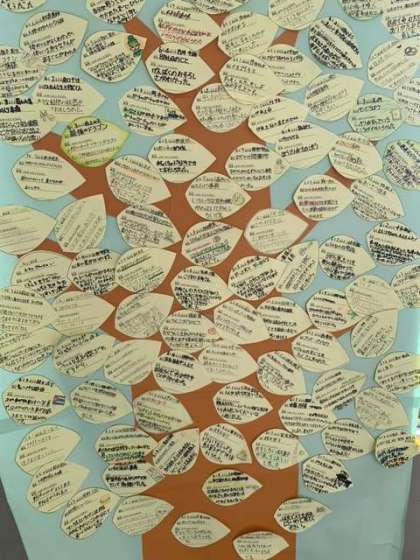 各学年の教室前の廊下には、読書の木が掲示されています。子どもたち1人ひとりのおすすめの本を、葉に一言書いて、木の枝に貼り付けていきます。互いに本の良いところを発信したりしてもらったりしながら、読書に親しんでくれると嬉しいです。