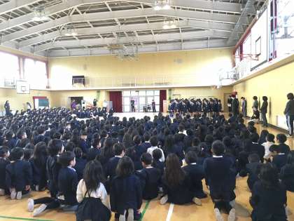 12月25日(金)、2学期の終業式を行いました。今学期は、2年生と5年生の発表がありました。現在、児童数増による増改築工事の一部が始まっています。西館3階の図工室を二つの普通教室にする工事です。28年度の学級増にむけての改造工事です。1月末完成の予定です。来年もどうぞよろしくお願い申しあげます。