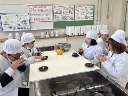 5年生の家庭科の授業風景です。お茶の淹れ方を学習しています。寒い日だったので、温かいお茶がとてもおいしかったようで、みんな「ほっ」とした表情をしていました。