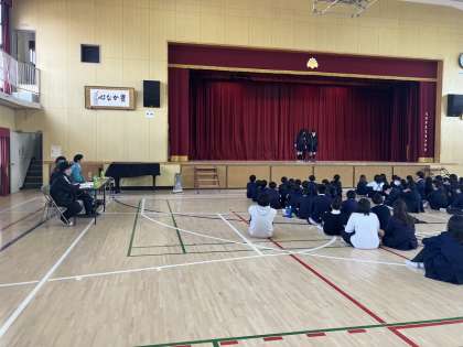 5年生、漫才ワークショップの様子です。吉本興業の芸人さんが子どもたちの漫才にアドバイスをしてくれます。緊張しながらも、話し方を工夫したり、小道具を用意したりとグループそれぞれの個性が光っていました。最後にはアンビシャスさんとチャイルドプリンスさんの漫才が披露され、大盛り上がりに終わりました。